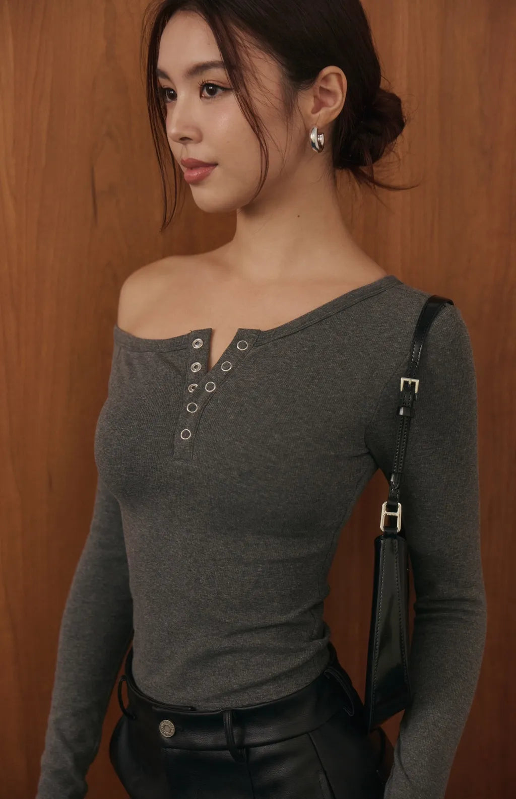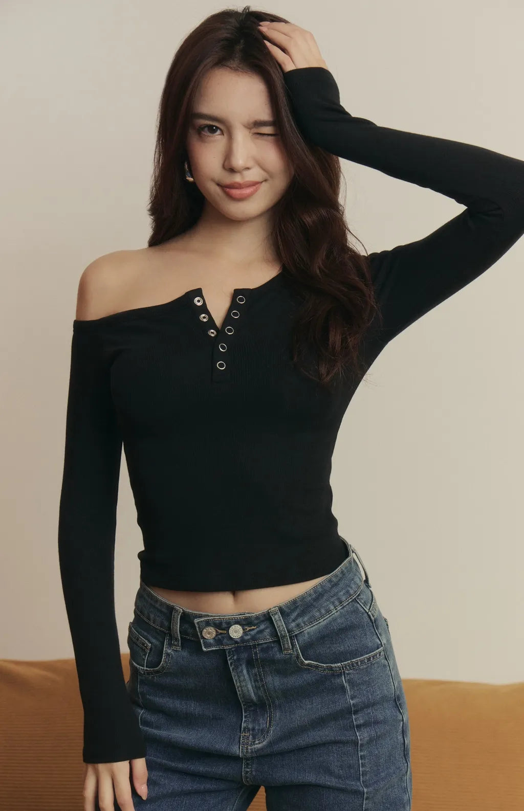 Off-Shoulder Buttoned Long-Sleeve Bra Top