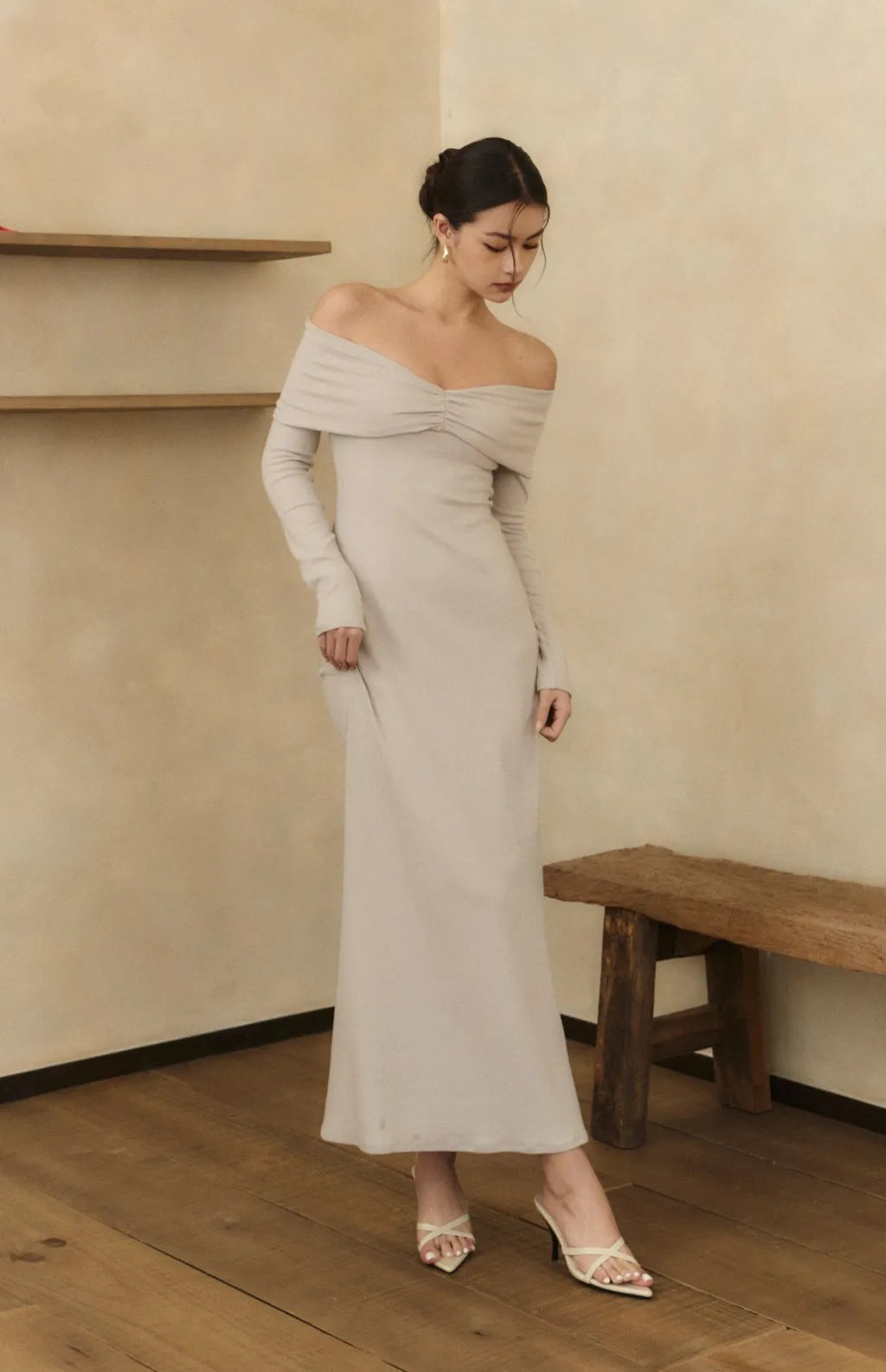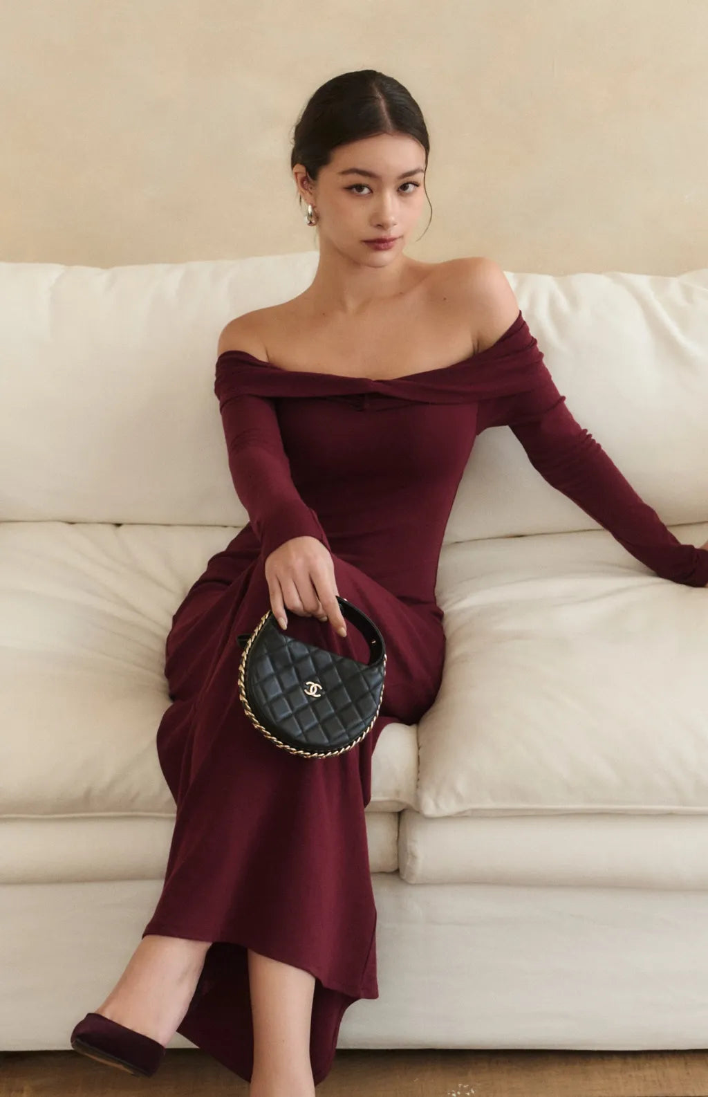 2.裸肩一字領設計,展現優雅肩頸線條